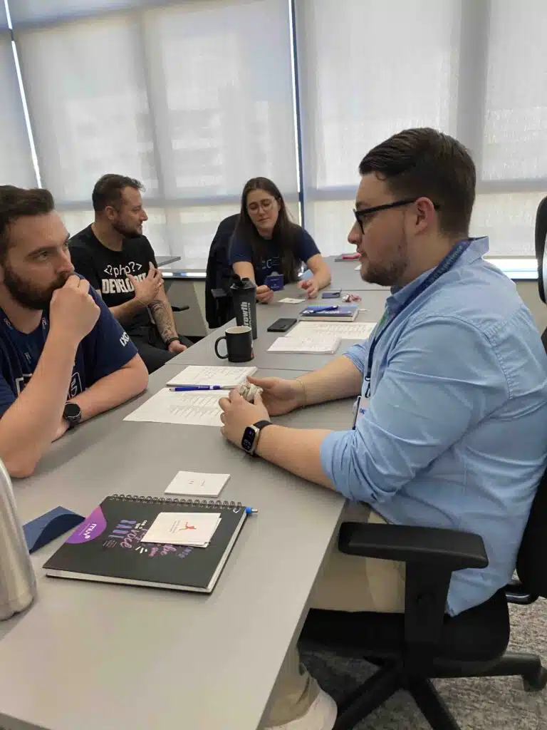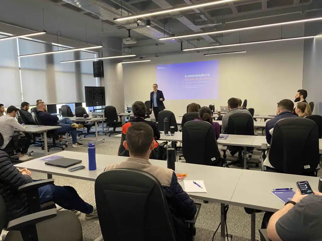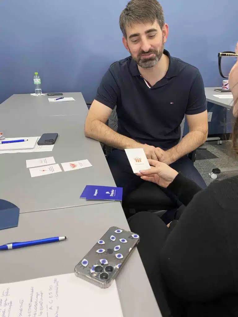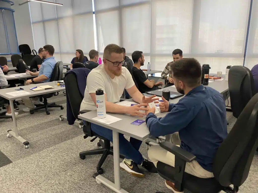 Aplicamos metodologias ativas e gamificação, com muita prática de conversação para abordar temas como comunicação não-verbal, comunicação não-violenta para conversas difíceis e técnicas de rapport para gerar maior conexão nas relações e fluidez nos processos.