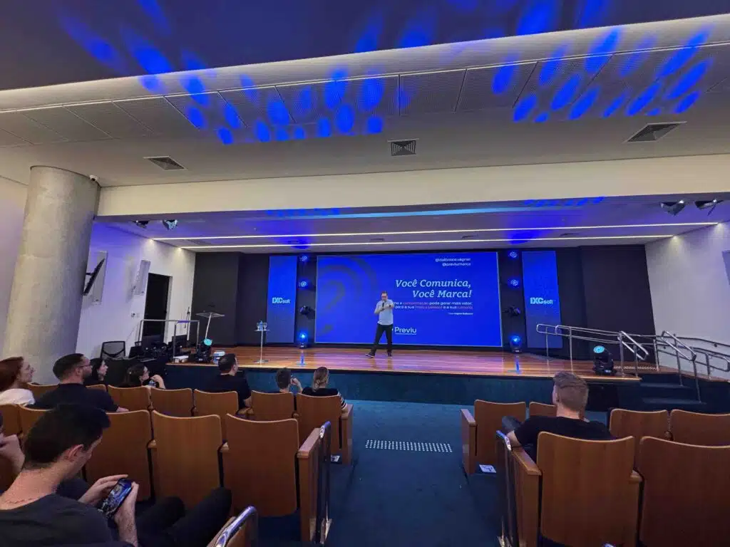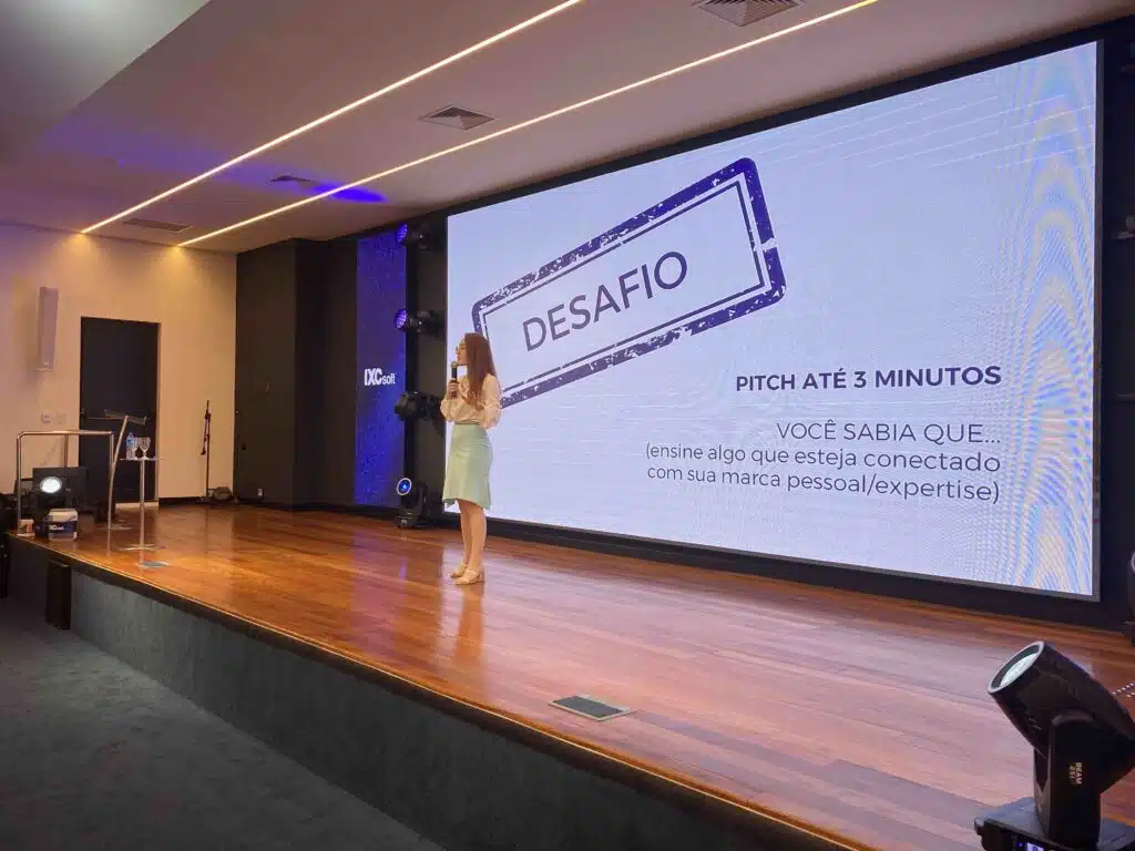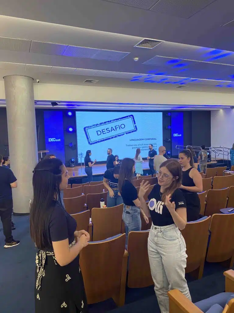 Os participantes aprenderam um método para apresentações em público e praticaram exercícios de comunicação não-verbal. O encontro encerrou com pitchs no palco.